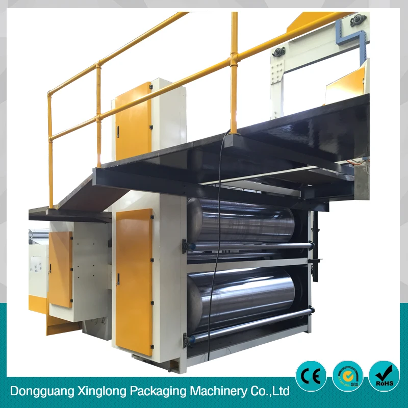 | 4 | Single facer | Corrugating roll diameter 360mm, adopt 48CrMo alloy steel, main bearing adopt Japan NSK brand,gluing part could level move out from machine,gluing holder adopt stainless steel,according to the speed PLC automatic adjust the glue thickness. |
