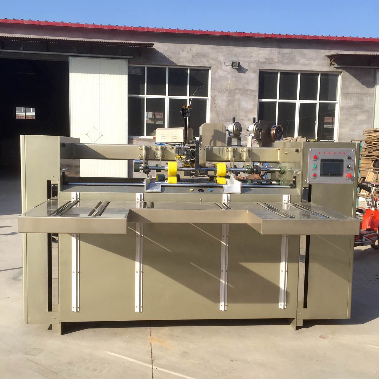 Double servo semi-auto stitching machine is latest improved product base on normal semi-auto stitching machine. The whole drive and running part adopt two pieces servo motor to drive machine running. The feeding part, stitching head and back baffle also adopt servo motor. When adjust back baffle through touch screen to operate, accurate, fast and convenient, needn’t worker take rule to adjusting. Improve the disadvantage of normal stitching machine used gear and bear to drive machine running, reduce the machine failure, prolong the machine use life. The stitching machine is the idea equipment in carton factory.